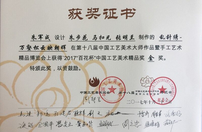 2017 年 10 月 22 日,在中国工艺美术界引起瞩目的十八届中国工艺美术大师作品暨国际艺术精品博览会 2017 百花杯中国工艺美术精品奖评选中,扬州市礼好一然绣研究院传来捷报,由朱军成、朱步花、马扣兄、张明兰合作的苏绣 – 乱针绣作品《万壑松云映朝晖》一举斩获金奖,这一荣誉的背后是创作者们对一然绣工艺的极致追求。