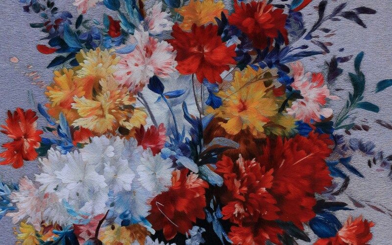 在作品的整体布局上,绣工们也独具匠心。几枝康乃馨相互簇拥,高低错落,花朵与枝叶的搭配和谐自然,既突出了康乃馨的主体地位,又展现出整束花的生机与活力。