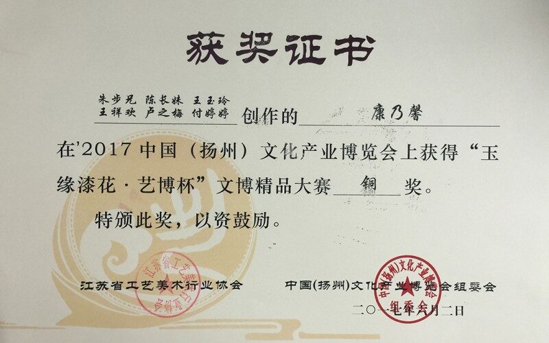 在 2017 年 6 月 2 日的扬州文化产业博览会上,扬州市礼好一然绣研究院的绣作《康乃馨》荣获铜奖。该作品由朱步兄、王祥欢、付婷婷、陈长妹、殷小宁、卢之梅合作绣制,朱军成大师领衔创作并给予艺术指导,其工艺精湛之处值得深入品味。