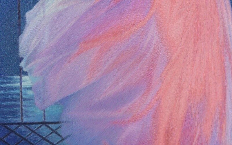 女郎所穿着的长裙是该作品的一大亮点。粉色的裙摆层次丰富,绣娘们运用不同深浅的丝线来表现裙摆的褶皱和飘逸感。从粉色渐变到淡紫色的裙摆,色彩过渡自然流畅,每一处褶皱都通过丝线的疏密和走向逼真地呈现出来,仿佛微风轻轻拂过,裙摆便能随风舞动。