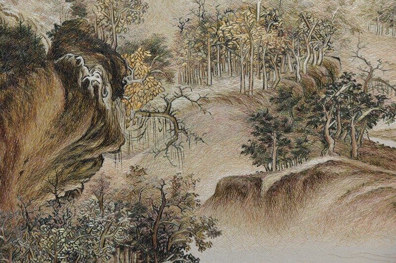 从针法运用来看,作品采用朱军成独创的一然绣法,这一技法在此得到了淋漓尽致的展现。绣线粗细在 1/4 根到 1/16 根之间灵活变化,粗线用于勾勒山体的轮廓和主要枝干,使画面呈现出一种大气磅礴的立体感。比如画面中的山峰,用粗线绣制的轮廓显得硬朗而有气势。而细线则用于刻画细节,树叶以及山石的纹理都通过最细达 1/16 根绣线的精细绣制得以呈现。每一片树叶仿佛都在微风中轻轻摇曳,人物的姿态和动作也栩栩如生,仿佛能感受到他们在山水间的悠然自得。