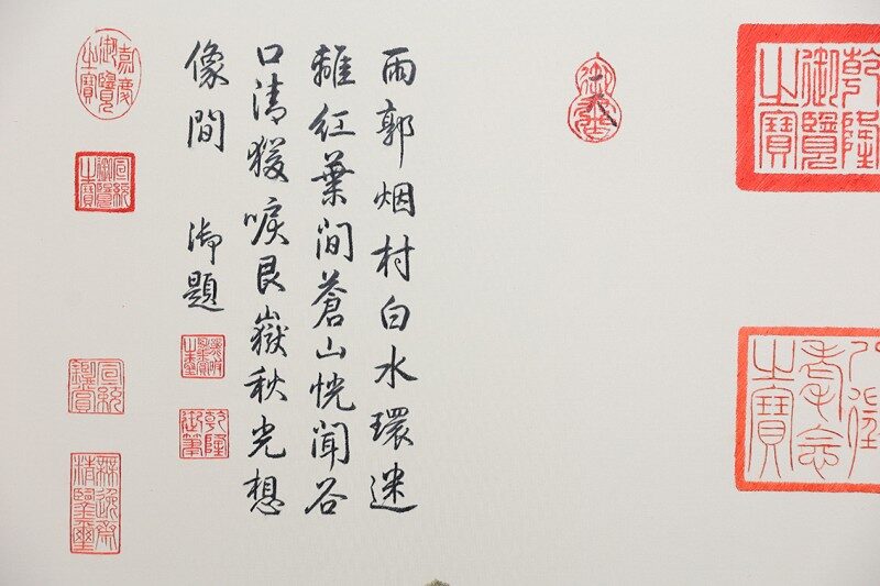 色彩处理上,充分体现了青绿山水的特色。绣工们精心挑选绣线,通过丝线的交织和叠加,实现了青绿颜色的自然过渡和层次感。从远处的山峦淡淡的青绿色,到近处树木浓郁的蓝绿色,色彩的渐变自然流畅,毫无突兀之感,完美地还原了青绿山水的意境。