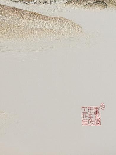 整体来看,这幅刺绣作品在有限的空间内营造出了宏大的山水意境,将一然绣法的魅力发挥到了较高水平,彰显了朱军成工作室高超的刺绣技艺和深厚的艺术底蕴。