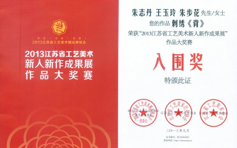 扬州市礼好一然绣研究院刺绣作品〈背〉,在 2013 年 9 月的江苏省工艺美术新人新作成果展大奖赛中入围获奖。