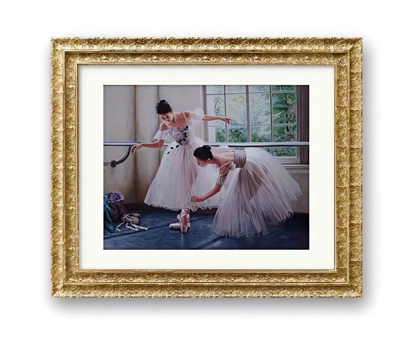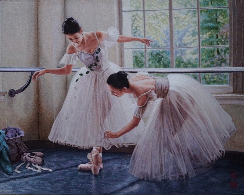 踏入展会现场,《舞伴》宛如一幅动人心弦的艺术画卷,将观众瞬间带入了一个如梦如幻的舞蹈世界。画面中,一位身姿婀娜的舞女静静伫立在窗前,阳光如金色的丝线倾洒而下,轻柔地抚摸着她那透明白色的纱裙。朱军成以其鬼斧神工般的苏绣乱针绣技艺,将这一美妙瞬间刻画得细致入微。纱裙在阳光的映照下,呈现出丰富而细腻的光影变化,每一丝光线的折射、每一处褶皱的起伏都通过绣线的精妙交织得以完美呈现,仿佛那纱裙正随着微风轻轻摇曳,散发着迷人的光泽与质感。而另一位舞女正专注地弯腰为其整理舞裙,她的神情专注而温柔,手指的动作细腻而自然,朱军成通过绣线的巧妙排列,将这一充满温情与友爱的瞬间定格在绣布之上,让人不禁为这份真挚的情感所动容。