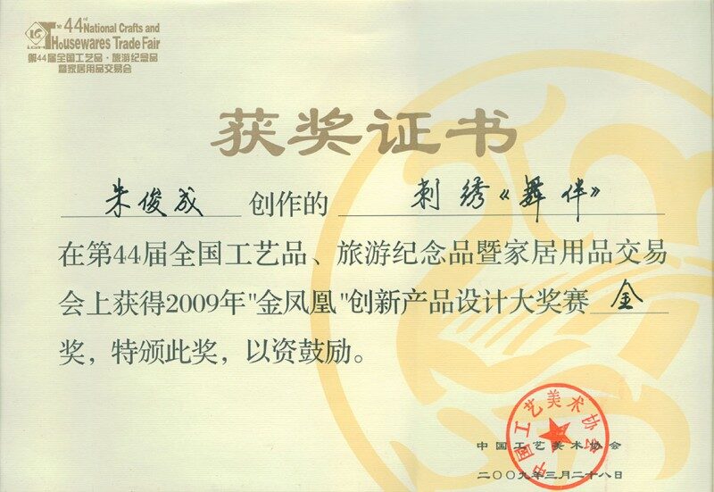 扬州市礼好一然绣研究院《舞伴》,在 2009 年 3 月 28 日举办的第 44 届全国工艺品、旅游纪念品暨家居用品交易会上,成功摘得 2009 年 “金凤凰” 创新产品设计大奖赛金奖,吸引了全场观众与业内人士的高度瞩目。