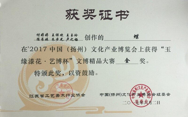 在 2017 年 6 月 2 日的扬州文化产业博览会上,扬州市礼好一然绣研究院的一然绣作品《蝶舞》惊艳全场,一举荣获金奖。这一杰出作品由付婷婷、王祥欢、王玉玲、陈长妹、卢之梅、朱步兄携手绣制,在朱军成大师的领衔创作与艺术指导下诞生。
