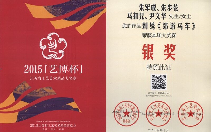 2015 年 10 月,由朱军成领衔,朱步花、马扣兄、尹文华合作的一然绣作品《郊游马车》,在江苏省工艺美术精品大奖赛 2015 艺博杯上荣获银奖。从图片所展示的艺术效果来看,《郊游马车》在工艺上的精湛程度令人折服。